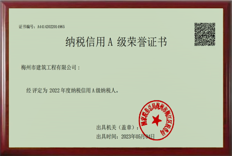 納稅信用A級(jí)榮譽(yù)證書(shū)